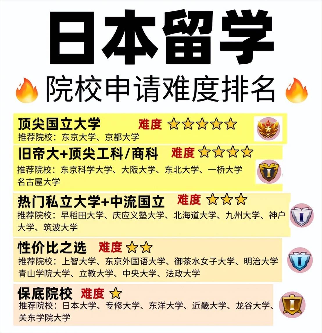 若是不想承担太高合作压力,又想兼顾学校实力和就业,那这一梯队的院校可谓“性价比之王”,适配国内尾部优良院校和出名院校程度,既能学校承认度,又能降低备考难度。 选校从来不是“比谁的学校更出名”,而是“谁的选择更贴合孩子的将来”。也许你家孩子适合冲刺出名国立,也许处所特色院校才是“性价比之王”,但无论若何,只要“对的选择”。 家长们常说:“别人都冲刺东京大学,我们是不是也该尝尝?”学生们纠结:“MARCH校听起来名气大,但我的专业实的适合吗?”这种焦炙源于对日本教育系统的不熟悉?。 日本留学的是:院校选择更像“拼图”——需要连系成就、专业、地区、经济前提等度婚配,而非一味“向上够”。 适合人群:这一梯队的院校是国内优良院校、日语N1+、托福80+的学生,提前规划研究标的目的、多加入学术勾当,会更有合作力。 若是成就优异但冲刺清北有难度,那日本的这几所学校刚好适配国内优良院校程度,属于“踮踮脚能摸到”的方针。 不少打算赴日留学的家庭,城市被选校这件事难住——国内有清晰的 优良院校划分,可日本大学总提“旧帝大”、“MARCH”,这些目生的称号到底代表什么程度?担忧选高了考不上,选低了又耽搁将来,其实只需摸透日本院校的“梯队”,选校就能少走良多弯。今天就用大师熟悉的国内院校做参照,把日本大学分梯队讲大白,从冲刺到保底,帮你找到最适配的方针! 若是想正在东京就业,优先选首都圈的院校(如 MARCH、建波大学),练习便利且企业校招会更稠密;若是想留正在关西,“关关同立”就是更好的选择,本地企业对这些学校的承认度远超外埠院校。 育教英学一个专注于为学生供给全方位择校留学征询办事的专业平台,我们努力于成为每一位有志于海外肄业的学子相信的伙伴。 最初也提示大师,日本大学申请周期长,提前1-2年预备言语(日语N1/N2 +托福),研究打算书多找前辈或教员点窜,别错过院校的“出愿时间”(良多学校一年只招一次)。祝大师都能找到最适合本人的日本院校,成功留学之旅! 除了东京、京都大学,日本还有5所“旧帝国大学”——北海道大学、、大阪大学、名古屋大学、九州大学。它们是日本高档教育的“老牌劲旅”,学科全面且科研实力雄厚,好比的材料科学、大阪大学的医学,都正在全球排名靠前。 若是更看沉“不变上岸”,同时但愿结业后能正在日本成功就业,那这一梯队的院校刚好适配国内通俗院校和优良一本程度,招生规模大、学科全面,且正在本地就业有劣势。 还有东京外国语大学,外语讲授程度日本第一,日语、韩语、东南亚小语种专业实力强,想处置外事、翻译相关工做的学生,选这所学校准没错。 别的还有“日东驹专”(日本大学、东瀛大学、驹泽大学、专修大学),招生规模大,学科设置全面,适合日语N2、成就中等的学生,结业后正在东京周边中小企业就业很有保障。 好比想读商科,不必然非冲要东大,一桥大学的商科承认度更高;想读外语,东京外国语大学比良多分析校更有劣势。日本企业聘请时,很看沉 “专业对口”,特色强校的结业生反而更受青睐。 上智大学国际空气浓,外国语、国际关系专业是特色,良多课程用英语讲课,适合英语根本好的学生;东京理科大学则是“私立理工科强校”,化学、物理专业正在日本排名靠前,就业时和公立工科院校承认度相当。 早稻田大学和庆应义塾大学,是日本私立大学的“天花板”。早稻田的、商学人气高,留学生数量多,校园勾当丰硕;庆应则被称为“企业家摇篮”,日本上市公司社长中,每10人就有1位结业于庆应,校友资本十分强大。 日本并没有的“大学群排名”轨制。所谓“大学群”,大多是由、考生、补习机构或者社会习惯逐步构成的非正式称号。并不等同于国度教育认证,而是社会遍及共识的一种“学术条理、社会评价和就业合作力”的意味。大学群的呈现,次要源于日本高中生加入大学入学测验时的参考。 好比一桥大学,虽然分析排名不算最靠前,但倒是日本的“商科天花板”,经济学、运营学专业结业生正在金融、征询行业就业率高;建波大学、横滨国立大学、千叶大学则是“首都圈国立强校”,地舆好(接近东京),练习、就业机遇多,理工科、教育学专业都很有劣势。 若是现正在还不确定本人适合哪所学校,不妨先明白这两个问题:“将来想读什么专业?结业后想正在日本哪个地域就业?”把标的目的理清,再对照梯队找学校,选校就会清晰良多。 适合人群:这一梯队的院校适合日语N1、托福70 +的学生,只需研究打算书贴合传授标的目的,备考节拍稳妥,登科概率很高。 “孩子想去日本留学,可网上查的消息又杂又乱,不晓得哪些学校才算实的好?”“明明看名字都差不多,怎样有的结业就能进大手企业,有的却要愁就业?”。
