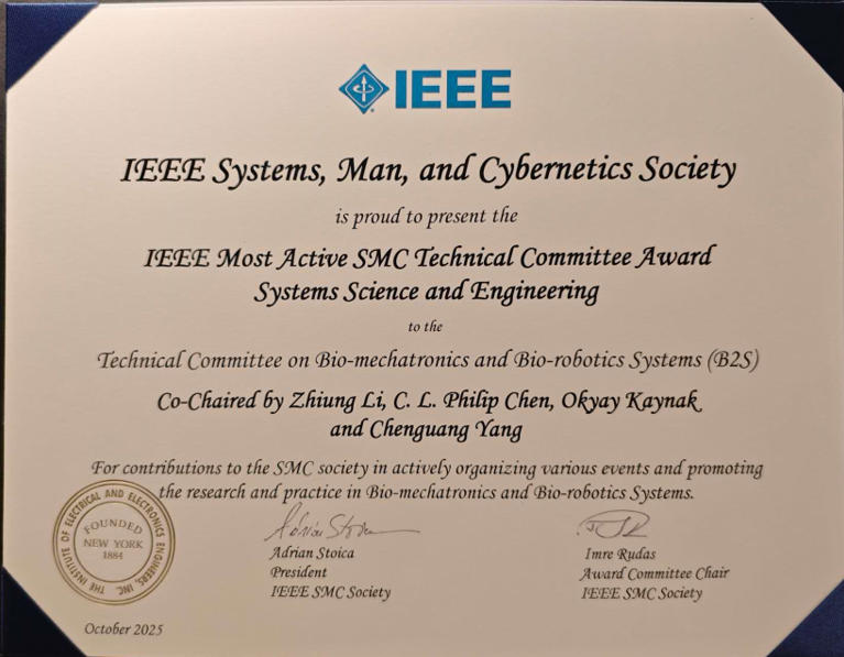 做为IEEE SMC Technical Committee on Bio-mechatronics and Bio-robotics Systems,李智军传授率领朝气电取仿朝气器人系统手艺委员会克意朝上进步,凭仗其正在手艺立异、学术勾当组织、从70多个手艺委员会中脱颖而出,荣获该项。 IEEE SMC手艺委员会是学会下设的专业分支组织,聚焦特定手艺范畴,推进学术交换、每个手艺委员会由该范畴具有国际影响力的专家学者带领,来自全球高校、科研机构取财产界。李智军传授牵头的朝气电取仿朝气器人系统手艺委员会于2016年成立,并充实操纵这些认知来开辟立异方式取手艺,用于设想和建立高机能、受生物的机械取系统,以仿照人类、动物及其他生命体。手艺委员会成立昔时便倡议了IEEE Internation Conference on Advanced Robotics and Mechatronics国际会议,至今该会议已正在新加坡、日本、成为中国从动化学会保举的A类会议,构成普遍影响,也推进了手艺委员会的不竭强大。将来,朝气电取仿朝气器人系统手艺委员会将继续秉承合做、逃求杰出的,促使更多高程度学术产出,筹谋更多高程度学术勾当,并进一步加强取其他学会、行业协会及国际组织的协同联动。(夏海生)?。