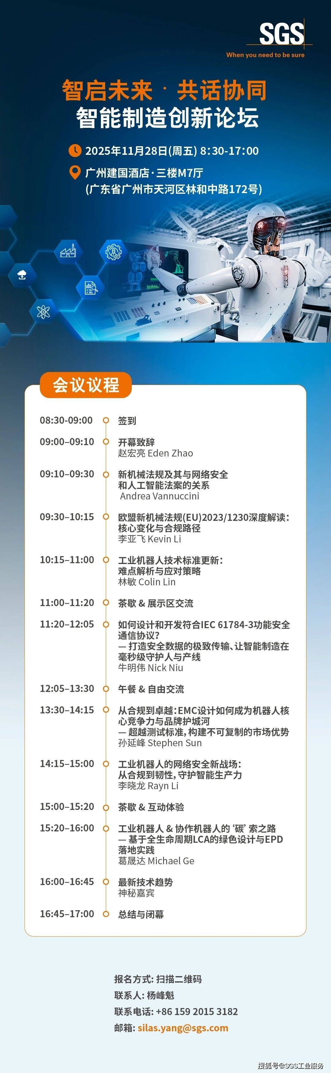 2027 年 1 月 20 日,AGV 等设备被纳入严管范围,收集平安、面临这场决定全球市场准入资历的变化,SGS工业部沉磅打制 “智启将来・共话协同 —— 智能制制立异论坛”,聚焦机械人行业,SGS工业办事专家取行业大咖联手打制 “合规解读 + 手艺实和 + 趋向预判” 三维内容矩阵,阐发工业机械人手艺尺度更新的难点解析取应对策略,从功能平安、电气平安、收集平安、全生命周期LCA 的绿色设想取EPD落地实践角度深度分解,用十年专业、丰硕的实和经验辅帮企业抢先获取指令过渡期步履线图。